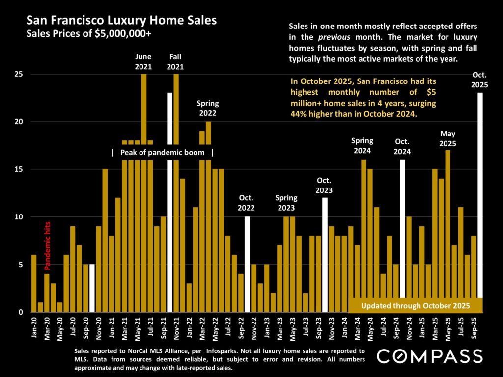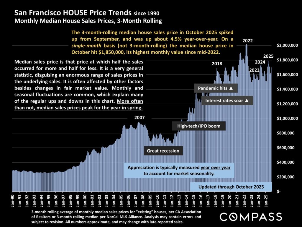 There’s a strong seasonal component to the residential market, so short-term fluctuations are a given. That said, the following chart shows a continuing upward trend in house sales prices in 2025, with shorter term indicators perhaps signaling an upward acceleration in prices. The median house price for SF in October hit $1.85 million, “its highest value since mid-2022.”
