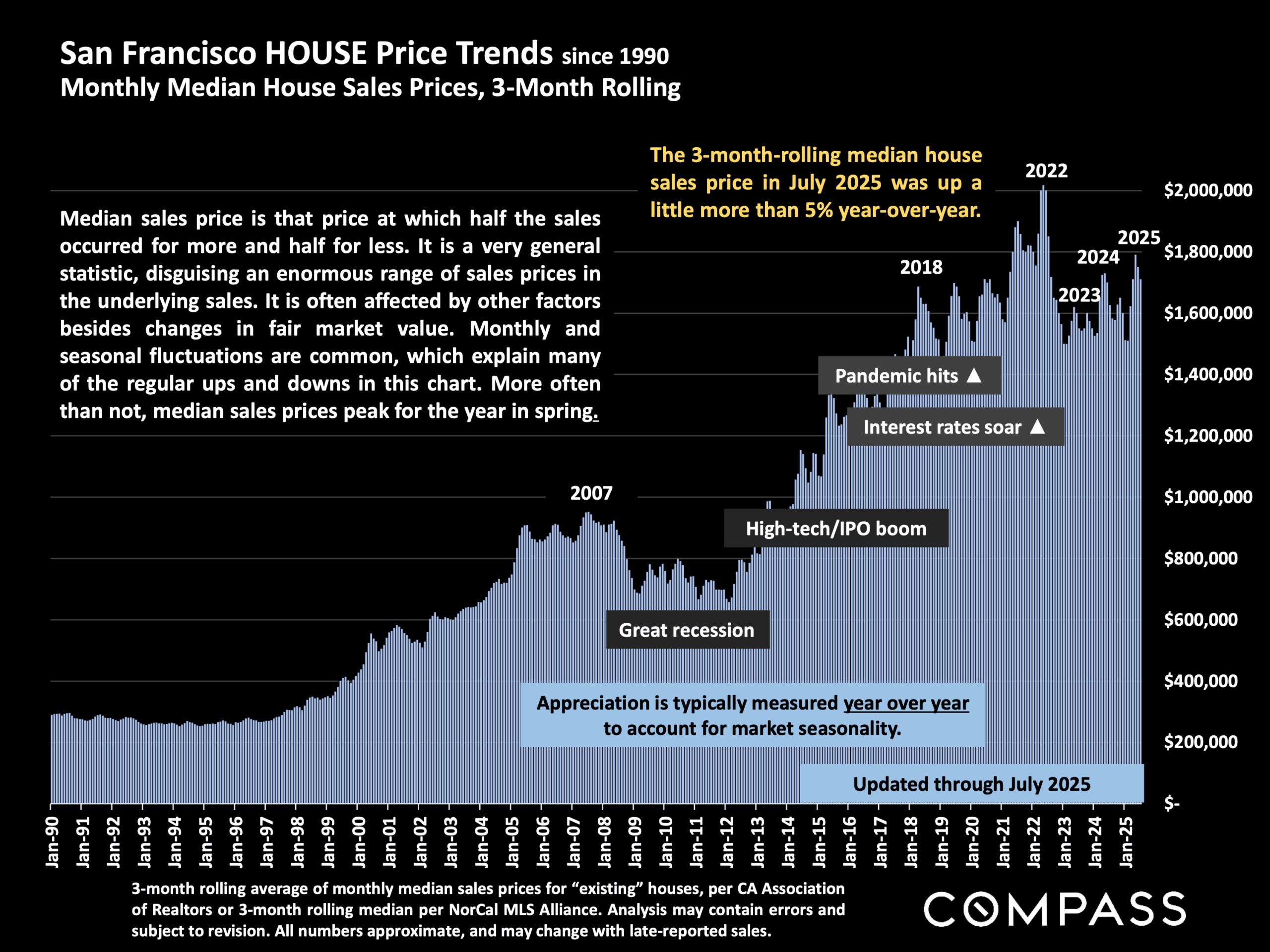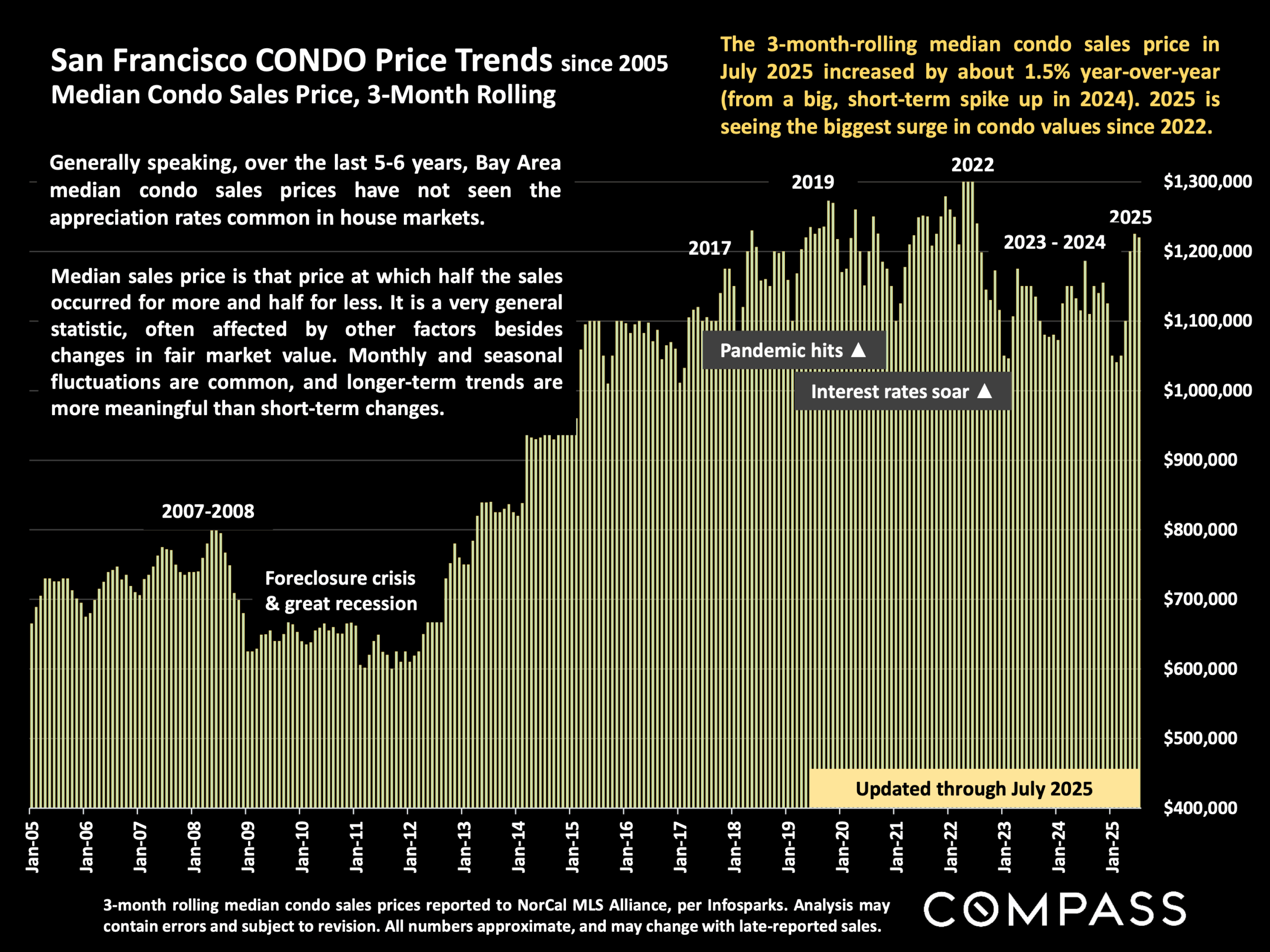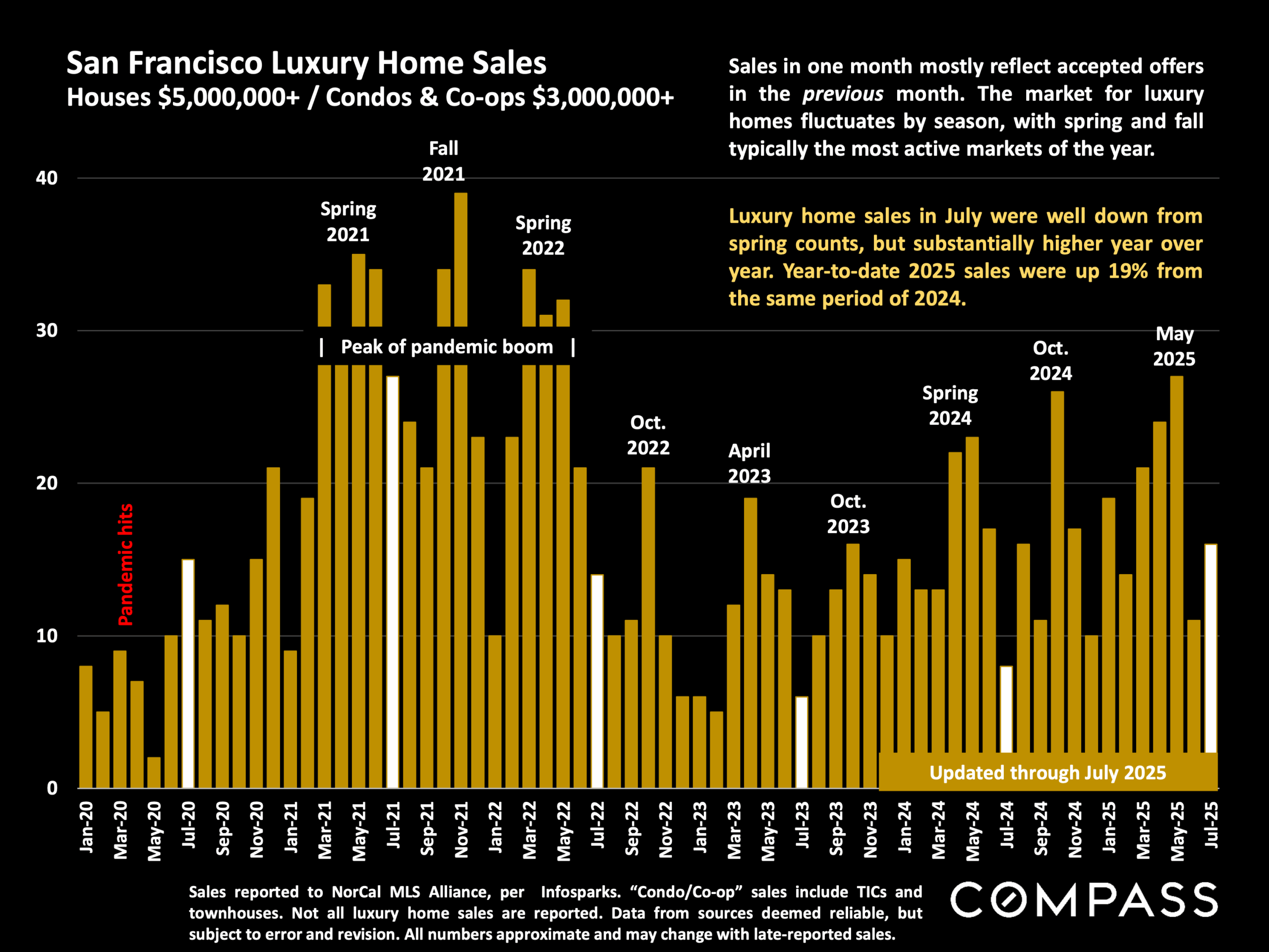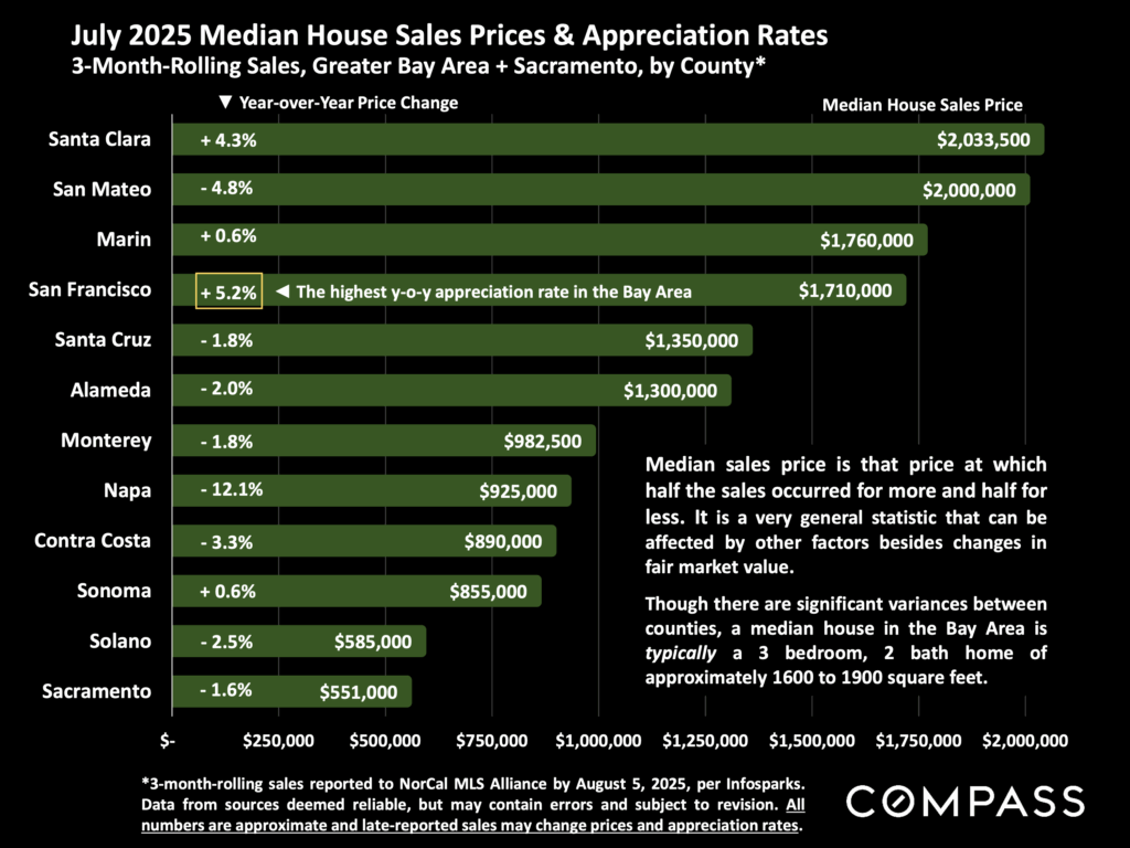 Beyond our stats on the residential sales market, there are other positive signs for San Francisco’s recovery. Over the last 12 months, rents in SF are rising at the fastest rate in the country, according to SF’s July Status of the Economy. Downtown foot traffic is also up, according to the same report. And AI companies are occupying a whole lot of downtown office space too. Perhaps we are not yet, as Nvidia’s Huang put it, “thriving again,” but I too feel that there’s new energy in town. In hipster neighborhoods like Hayes Valley, the Marina, the Castro and Valencia Corridor, you can see crowds once again spilling out of bars and restaurants – a remarkable change from just a year ago. While “recovery” brings its own challenges, including affordability, traffic, and an increasing divide between the haves and have-nots, signs of life returning to the city surely can’t be a bad thing.