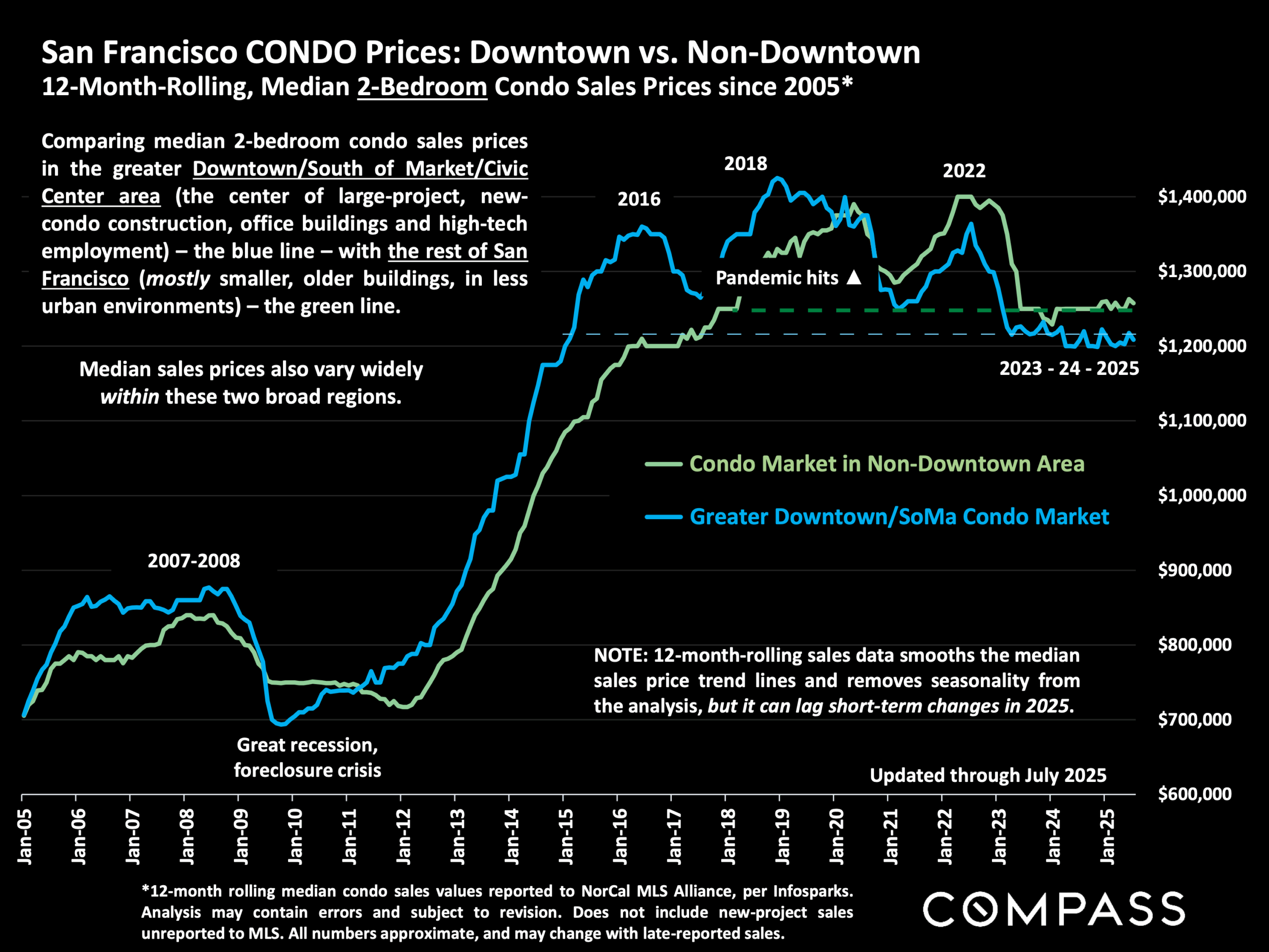 Condominiums have always been more sensitive to market forces than single family homes. And in SF, we’ve had two geographic markets, broadly speaking: condos in newer high-rises in the downtown/South of Market area (SOMA) and condos in generally older, smaller buildings in SF’s neighborhoods. Condos in SOMA really took the brunt of the exodus from the city following the Covid-19 outbreak. While condos outside of SOMA fully recovered within a few years after the pandemic, condos within SOMA never got back to their 2018 highs (chart below). With interest rate hikes from the Fed’s tightening monetary policy starting in 2022, condo values everywhere slumped again. SOMA condos have been stuck at roughly 2015 values; non-SOMA condos are back down to 2018 values.