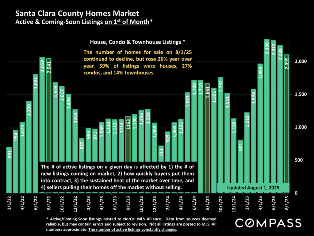 On the supply side, active and coming-soon listings for August have declined year over year, and every year, since 2022. While the number of listings on the market has a definite seasonal component, as reflected in the regular peaks and troughs visible in the chart below, the downward trend is the opposite of what is happening in other Bay Area Counties. Even Santa Clara County, which profits from the AI boom with the likes of Nvidia headquartered there, has shown consecutive annual increases in listings available (second chart).